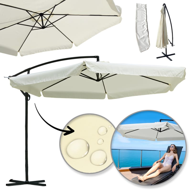 Parasol ogrodowy z wysięgnikiemParasol ogrodowy to idealny wybór dla osób poszukujących niezawodnej ochrony przed słońcem!Zaprojektowany z myślą o maksymalnej funkcjonalności i wygodzie. Zapewnia nie tylko cień, ale i ochronę przed szkodliwym promieniowaniem UV. Specyfikacja:- Poszycie parasola zapewnia odporność na m.in. przed wiatrem, deszczem i słońcem (filtr UV50+). Materiał jest wodoodporny.- Parasol posiada bardzo nowoczesny system regulacji wysokości i kąta nachylenia czaszy. - Solidny stelaż oraz 8 mocnych żeberek. Jakościowe wykonanie sprawia, że parasol znakomicie sprawdza się nawet przy niekorzystnych warunkach pogodowych.- Produkt jest składany, sposób rozkładania: korba. Materiał:- Materiał poszycia: 100% poliester, gramatura 180 gr/m2- Materiał stelaża: stal Budowa:- 6 stalowych żeberek 12 x 18mm- Stalowa kolumna 48 mm- Podstawa: krzyżowa Wymiary i waga:- Średnica czaszy: 300 cm- Wysokość: 262 cm- Szkielet: żeberka: 12x18 mm, kolumna o średnicy 48 mm Waga: 15 kg Wymiary opakowania:198cm x 32cm x 15cm