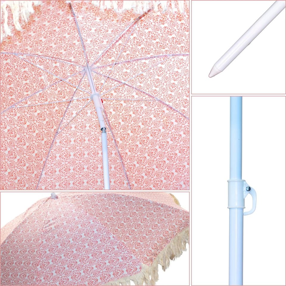 Parasol plażowo-ogrodowy z frędzlami świetnie sprawdzi się zarówno na plaży, w ogrodzie, jak i na tarasie czy balkonie. Jego kompaktowy rozmiar oraz regulowana konstrukcja umożliwiają łatwe dopasowanie do różnych miejsc i sytuacji. Niezależnie od tego, gdzie spędzasz czas – zawsze zapewni Ci stylową ochronę przed słońcem.