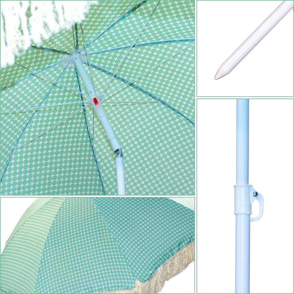 Stylowy i funkcjonalny, PARASOL PLAŻOWO OGRODOWY Z FRĘDZLAMI 174CM ZIELONY to idealne rozwiązanie na letnie dni. Zapewnia skuteczną ochronę przed słońcem, a jego designerski wygląd w klimacie boho odmieni każdą przestrzeń – od plaży po ogród.