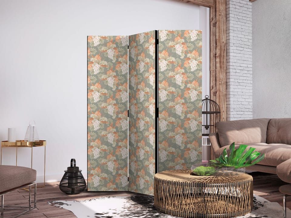Parawan - Bukieciki - egzotyczne kwiaty i liście na szaro - zielonym tle rozmiar 135x172, wykończenie Jednostronny