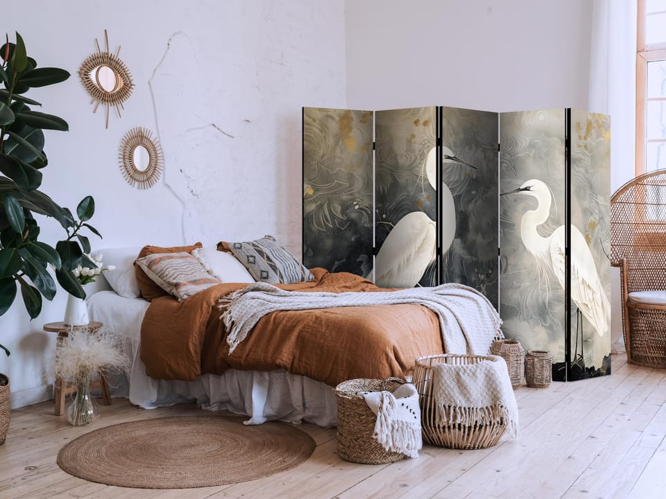 Parawan - Czaple i kwiat wiśni - ilustracja w orientalnym stylu przedstawiająca ptaki rozmiar 225x172, wykończenie Jednostronny