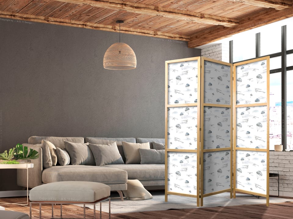 Parawan japoński - Akwarela - pokaz samolotów na jasnym niebie z delikatnymi chmurkami rozmiar 135x172, wykończenie