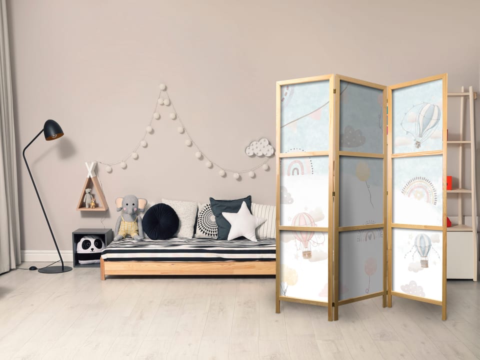 Parawan japoński - Balony na niebie - Balony w pastelowych barwach latające po zachmurzonym niebie - wśród tęczy i gwiazd rozmiar 135x172, wykończenie