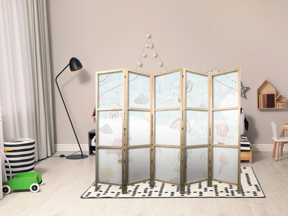 Parawan japoński - Balony na niebie - Balony w pastelowych barwach latające po zachmurzonym niebie - wśród tęczy i gwiazd rozmiar 225x172, wykończenie