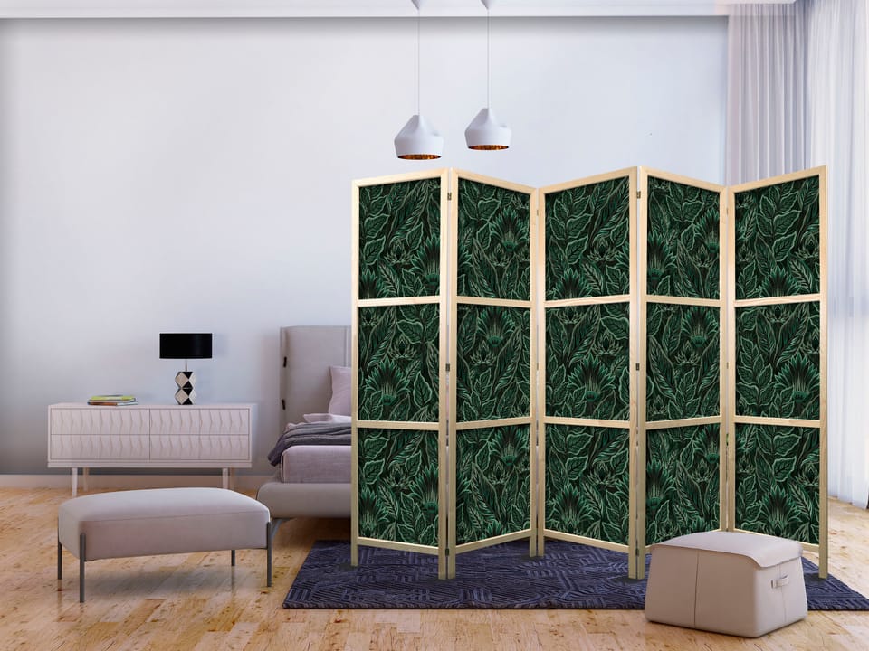 Parawan japoński - Gęsta roślinność - botaniczne wzory w ilustracyjnym stylu; zielone rozmiar 225x172, wykończenie
