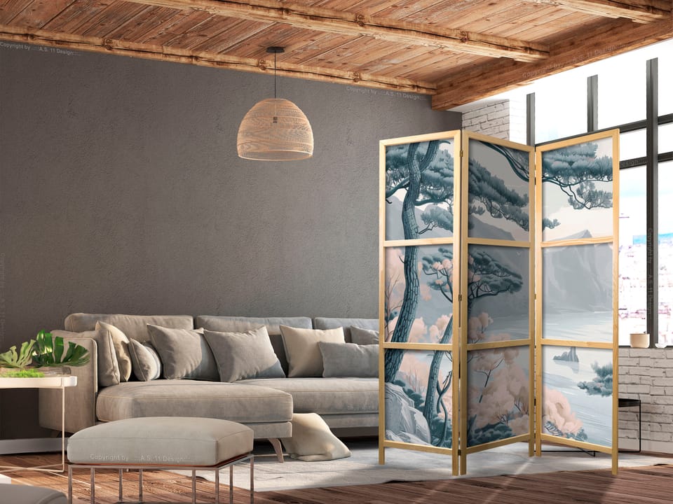 Parawan japoński - Górzyste wybrzeże z drzewami i skałami - w lekkich pastelowych błękitach rozmiar 135x172, wykończenie