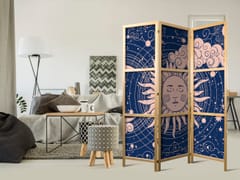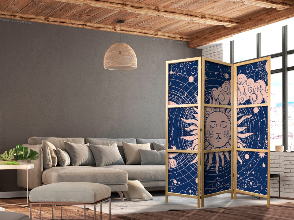 Parawan japoński - Kosmiczna Harmonia - ilustracja słońca i księżyca na granatowym tle rozmiar 135x172, wykończenie