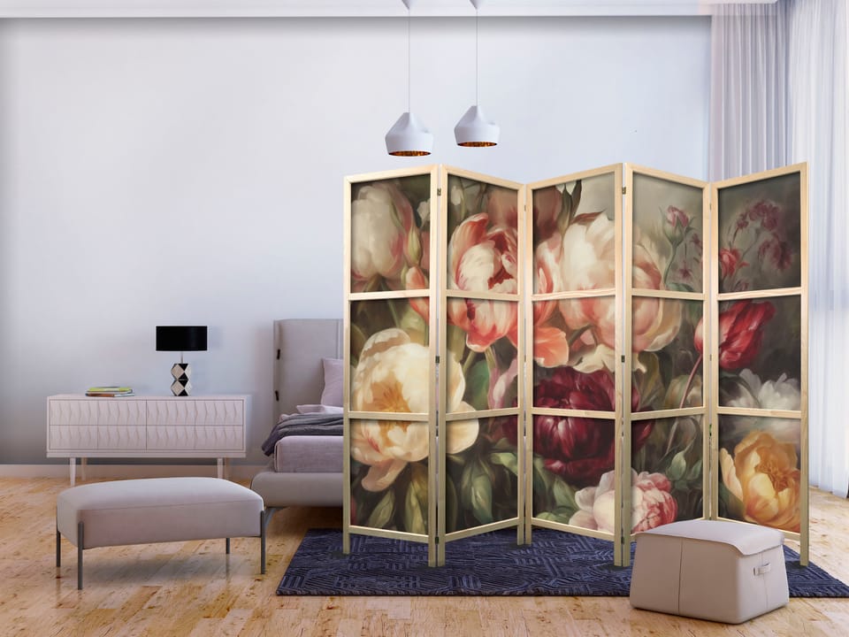 Parawan japoński - Kwitnące piwonie - charyzmatyczne kwiaty skąpane w słońcu rozmiar 225x172, wykończenie