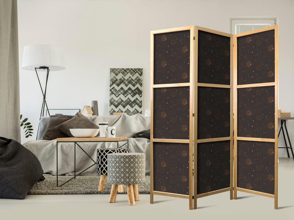 Parawan japoński - Nocne Niebo - artystyczna kompozycja słońc i planet na czarnym tle rozmiar 135x172, wykończenie