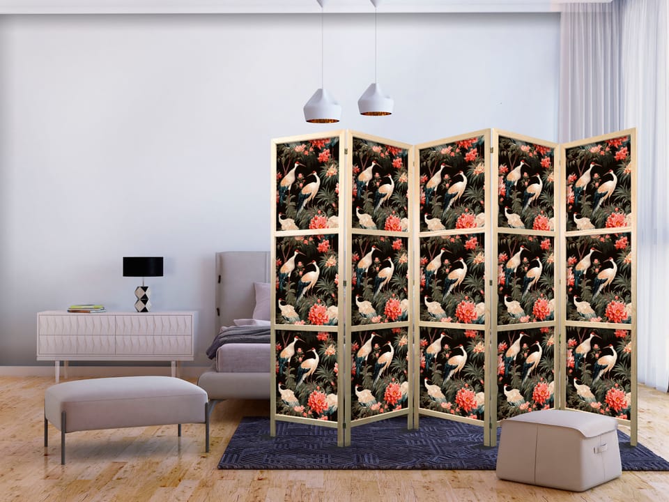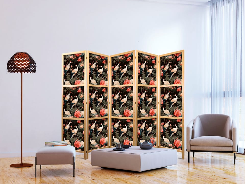 Parawan japoński - Ornament z ptakami - sylwetki żurawi i kwiaty piwonii na ciemnym tle rozmiar 225x172, wykończenie