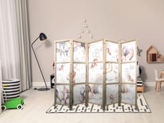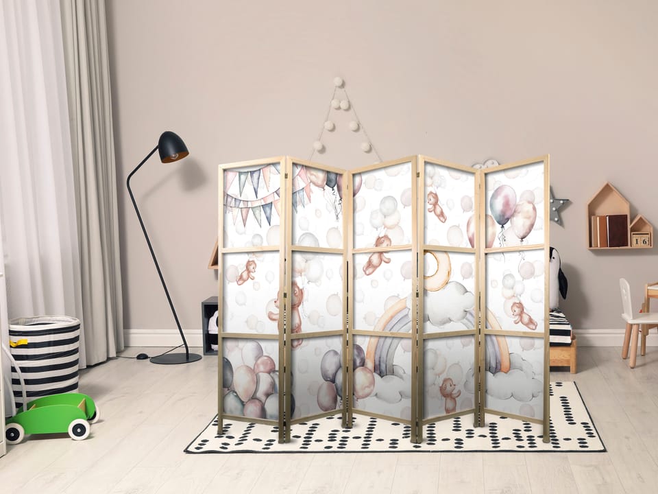 Parawan japoński - Pluszowe misie z balonikami - Latające jasno-brązowe misie pośród balonów - chmur i tęczy w stonowanej - pastelowej kolorystyce rozmiar 225x172, wykończenie