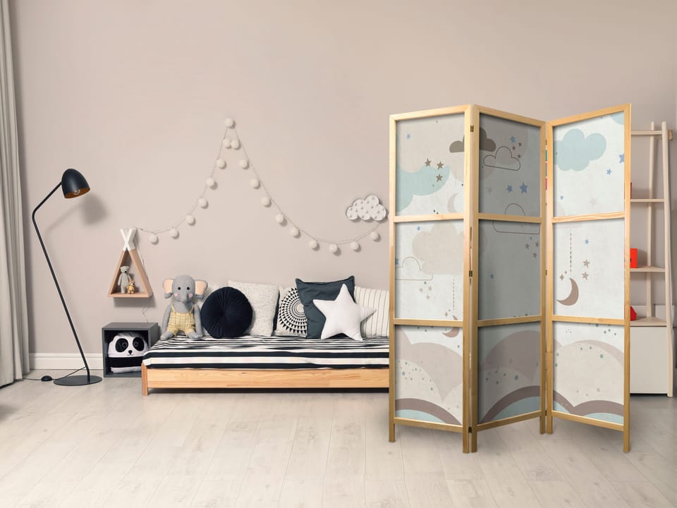 Parawan japoński - Pochmurne nocne niebo - Księżyce w brązach i beżach pośród licznych chmur oraz gwiazdek na jasnym tle rozmiar 135x172, wykończenie