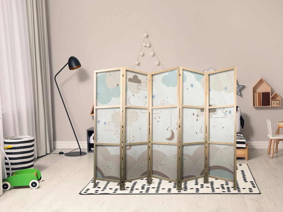 Parawan japoński - Pochmurne nocne niebo - Księżyce w brązach i beżach pośród licznych chmur oraz gwiazdek na jasnym tle rozmiar 225x172, wykończenie