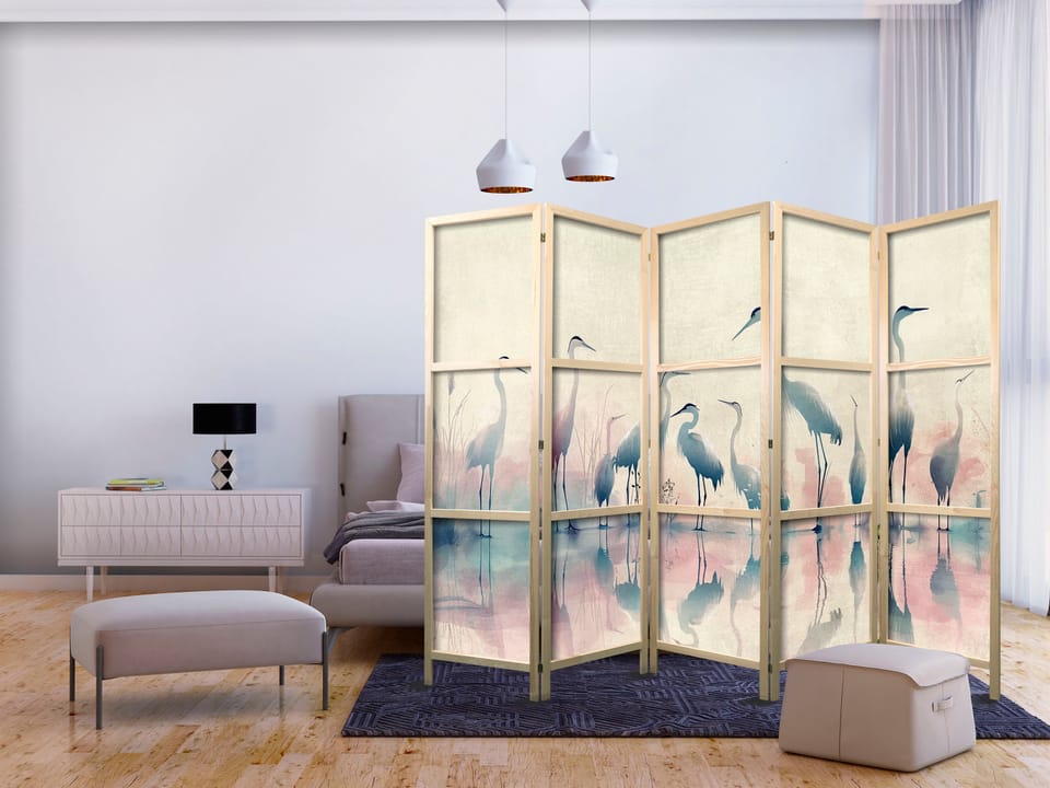 Parawan japoński - Ptaki nad jeziorem - czaple malowane akwarelą w delikatnej, szaro-różowej kolorystyce rozmiar 225x172, wykończenie