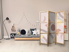 Parawan japoński - Radosne niebo - Żółte wesołe gwiazdki z tęczą na tle faz księżyca - na niebie w kolorystyce jasnego beżu rozmiar 135x172, wykończenie