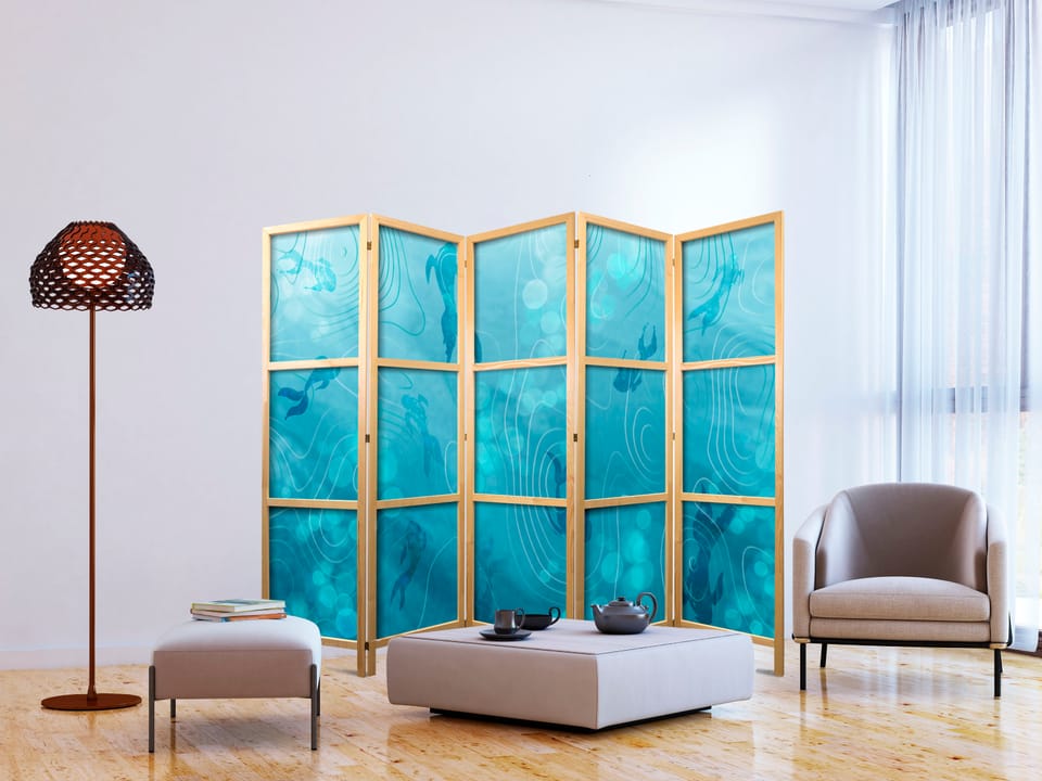 Parawan japoński - Rybki Koi pod taflą wody - Gromada japońskich ryb w głębinach stawu w odcieniach granatu i błękitu rozmiar 225x172, wykończenie