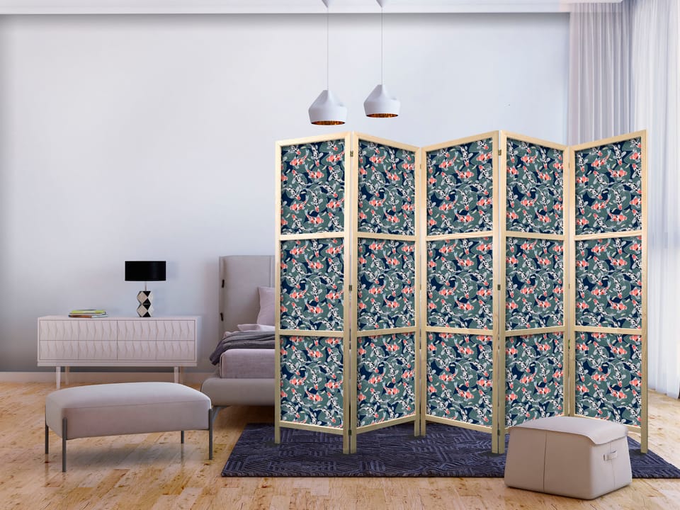 Parawan japoński - Rybki wśród liści - Barwne rybki Koi wśród ciemnozielonych lisci nenufarów na tafli granatowej wody rozmiar 225x172, wykończenie