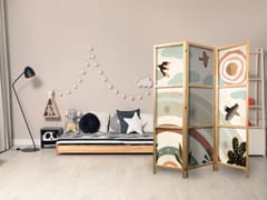 Parawan japoński - Słońce ponad tęczą - Ptaki w stonowanej kolorystyce - latające wśród chmur ponad tęczą i roślinnością na jasno-beżowym tle rozmiar 135x172, wykończenie