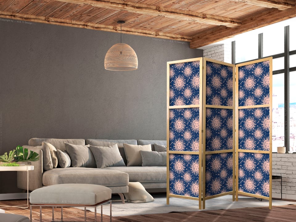 Parawan japoński - Słoneczne Wzory - powtarzający się motyw słońca na granatowym tle rozmiar 135x172, wykończenie