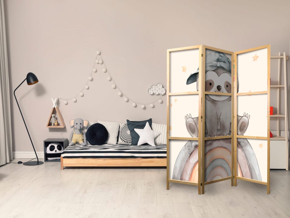 Parawan japoński - Szczęśliwy leniwiec - Leniwiec w stonowanych kolorach - w czapce z daszkiem - siedzący na tęczy wśród gwiazdek rozmiar 135x172, wykończenie