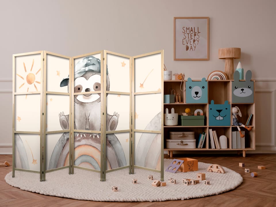 Parawan japoński - Szczęśliwy leniwiec - Leniwiec w stonowanych kolorach - w czapce z daszkiem - siedzący na tęczy wśród gwiazdek rozmiar 225x172, wykończenie