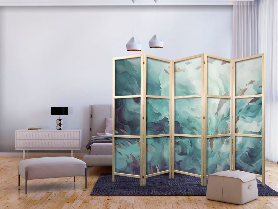 Parawan japoński - Trzy ławice ryb - Ryby w stonowanej kolorystyce pływające w grupach w oceanicznych głębinach rozmiar 225x172, wykończenie