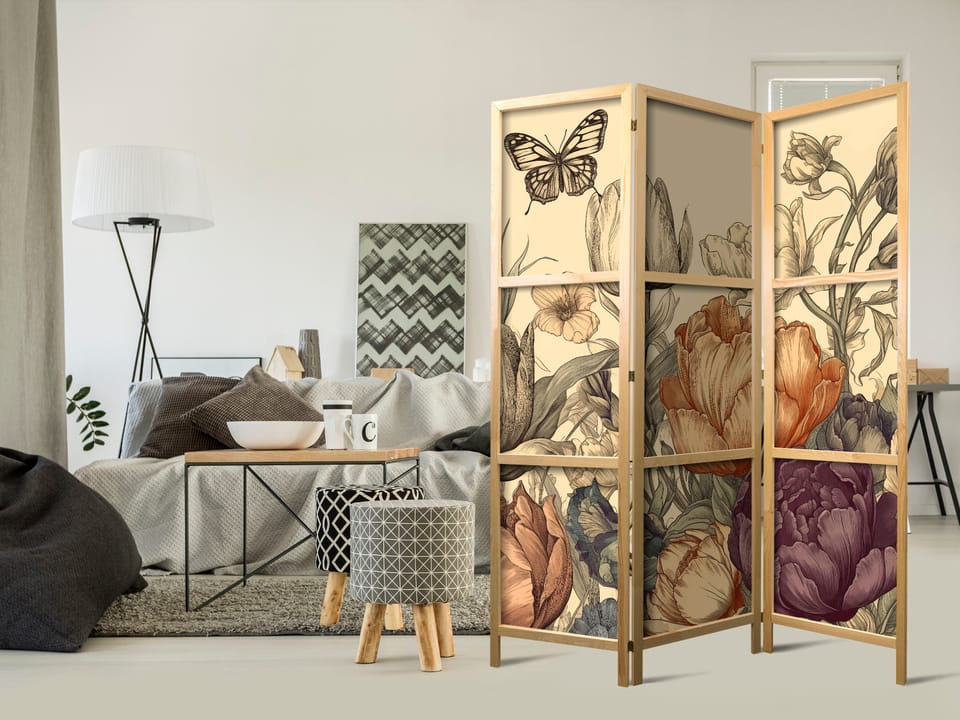 Parawan japoński - Tulipany w kremie - ilustracja kwiatów i motyli na jasnym tle rozmiar 135x172, wykończenie