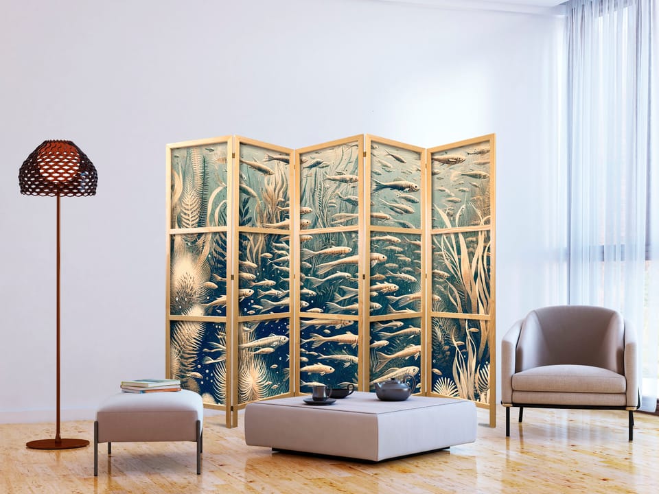 Parawan japoński - Życie w oceanie - Podwodny świat ryb i roślinności w kolorystyce beżowej i granatowej w stylu retro rozmiar 225x172, wykończenie