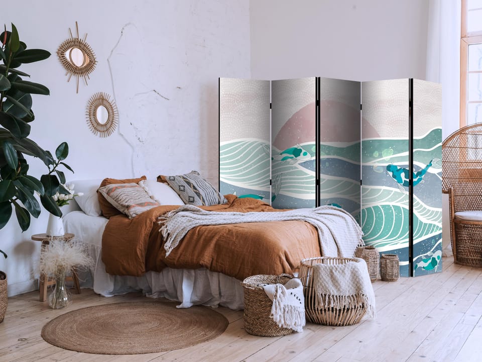 Parawan - Malowniczy krajobraz z rybami - Zachód słońca i rybki Koi w odcieniach turkusu i błękitu unoszące się ponad wodą rozmiar 225x172, wykończenie Dwustronny
