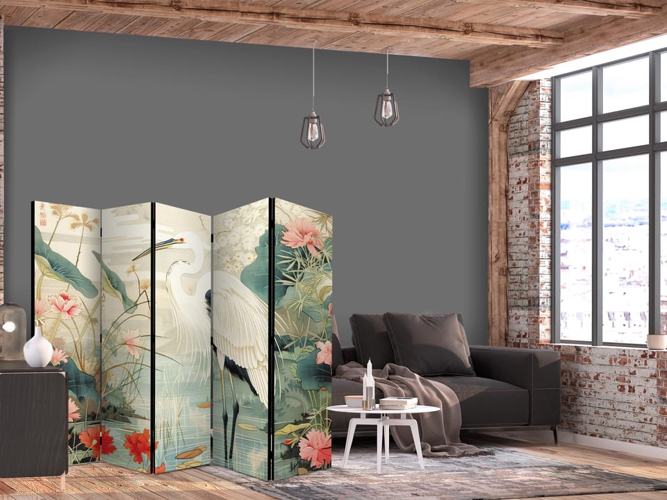 Parawan - Nad azjatyckim stawem - ilustracja w stylu japońskiej ryciny, przedstawiająca czaplę rozmiar 225x172, wykończenie Jednostronny