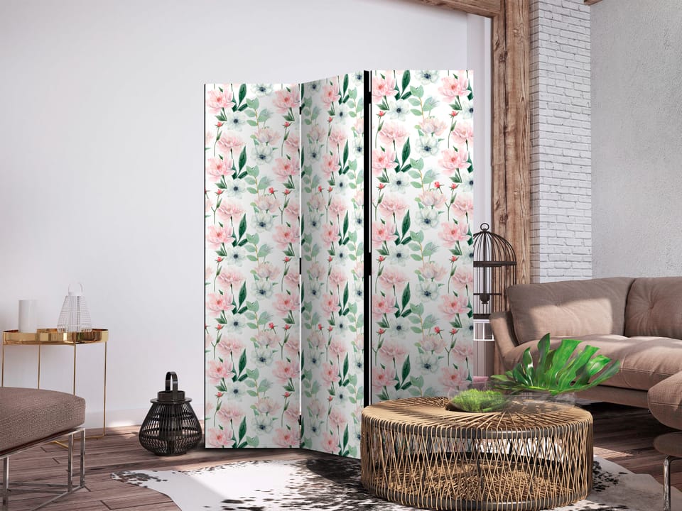 Parawan - Piwonie - różowe i białe kwiaty i zielone listki na białym tle rozmiar 135x172, wykończenie Dwustronny