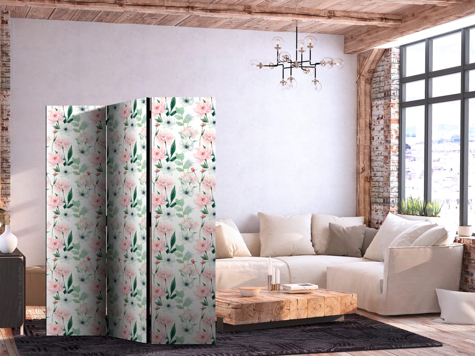 Parawan - Piwonie - różowe i białe kwiaty i zielone listki na białym tle rozmiar 135x172, wykończenie Jednostronny