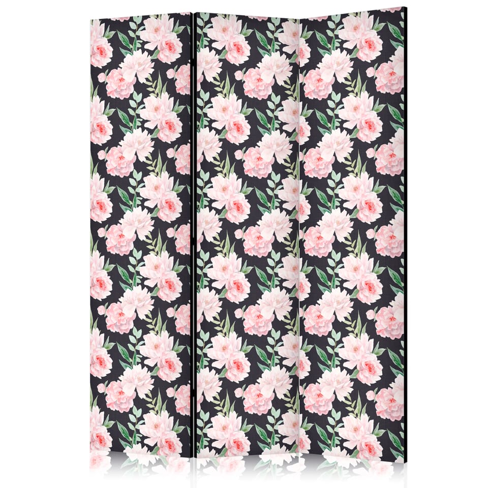 Parawan - Piwonie - różowe kwiaty i zielone listki na grafitowym tle rozmiar 135x172, wykończenie Akustyczny