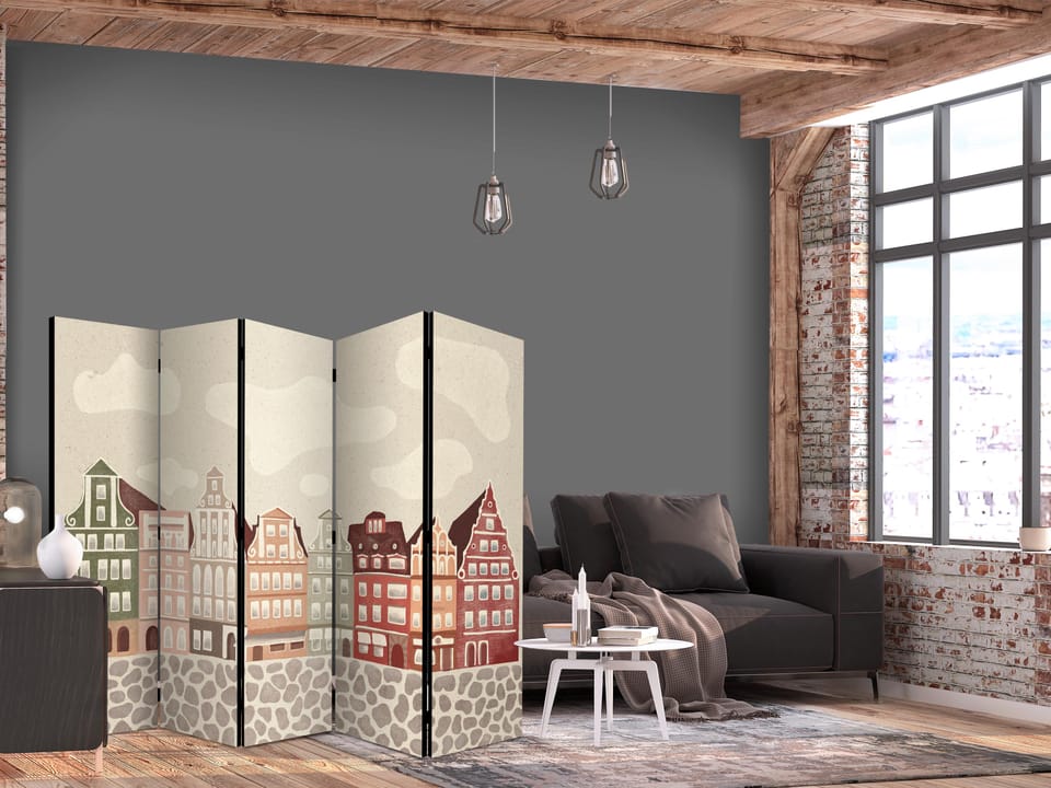 Parawan - Plac Solny - kolorowe ilustrowane kamieniczki na tle nieba z chmurami rozmiar 225x172, wykończenie Jednostronny