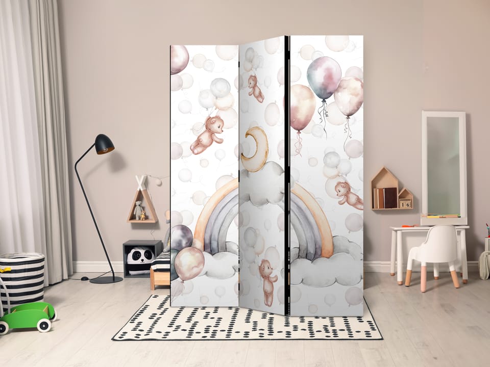 Parawan - Pluszowe misie z balonikami - Latające jasno-brązowe misie pośród balonów - chmur i tęczy w stonowanej - pastelowej kolorystyce rozmiar 135x172, wykończenie Dwustronny