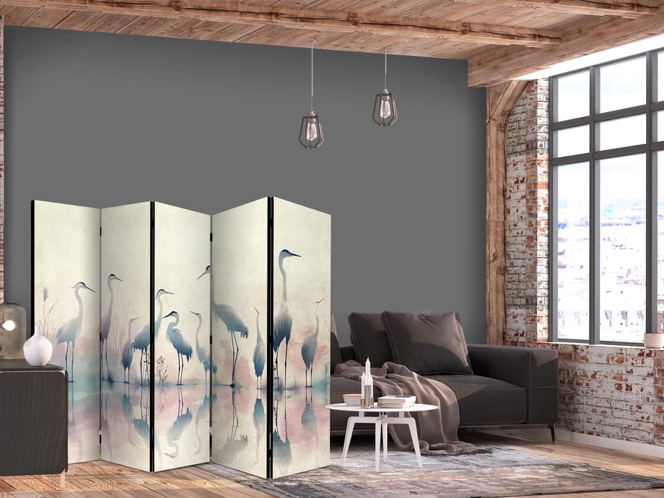 Parawan - Ptaki nad jeziorem - czaple malowane akwarelą w delikatnej, szaro-różowej kolorystyce rozmiar 225x172, wykończenie Jednostronny