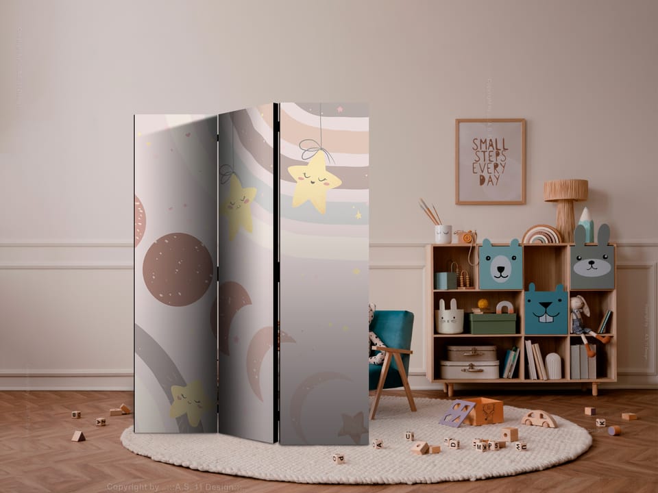 Parawan - Radosne niebo - Żółte wesołe gwiazdki z tęczą na tle faz księżyca - na niebie w kolorystyce jasnego beżu rozmiar 135x172, wykończenie Jednostronny