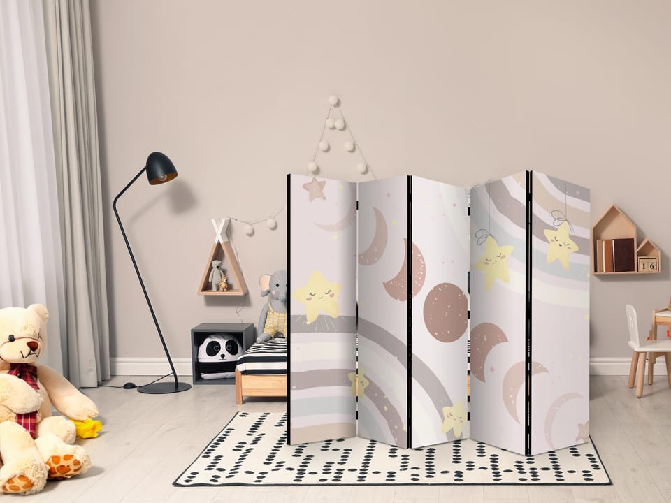 Parawan - Radosne niebo - Żółte wesołe gwiazdki z tęczą na tle faz księżyca - na niebie w kolorystyce jasnego beżu rozmiar 225x172, wykończenie Akustyczny
