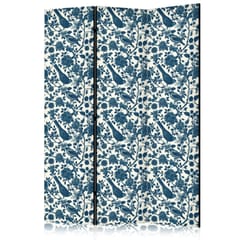Parawan - Różane pnącza - monochromatyczne niebieskie ptaki odpoczywające wśród róż rozmiar 135x172, wykończenie Akustyczny