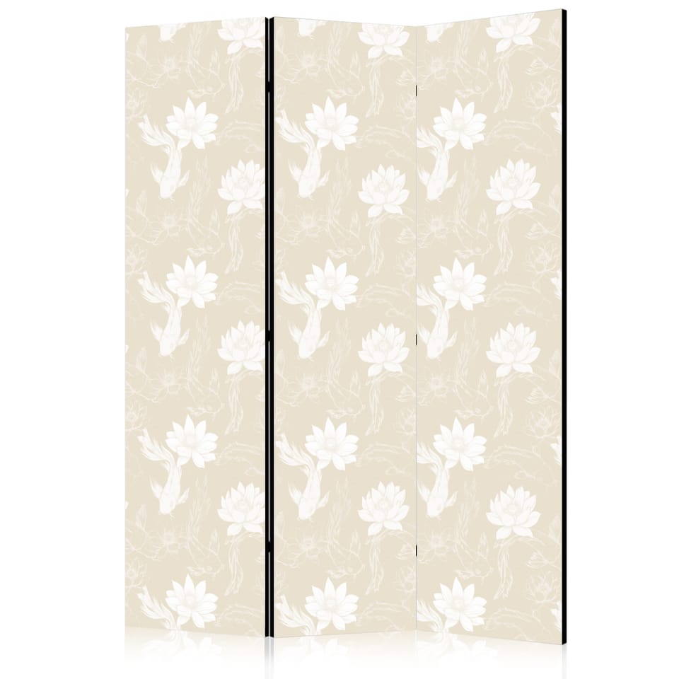 Parawan - Ryby i lilie wodne - Jasne orientalne ryby pływające pośród kwiatów wodnych na delikatnym piaskowo-beżowym tle rozmiar 135x172, wykończenie Akustyczny