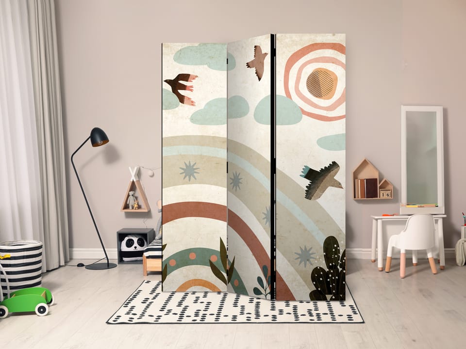 Parawan - Słońce ponad tęczą - Ptaki w stonowanej kolorystyce - latające wśród chmur ponad tęczą i roślinnością na jasno-beżowym tle rozmiar 135x172, wykończenie Jednostronny
