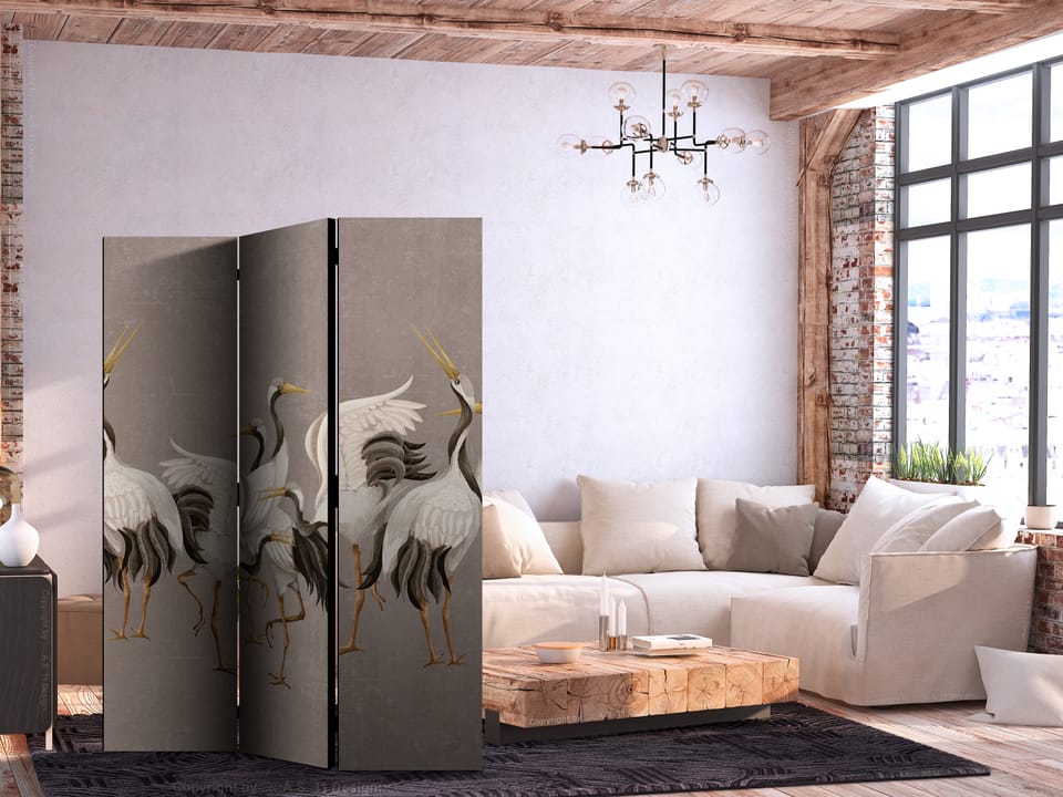 Parawan - Taniec żurawi - jasne sylwetki ptaków na ciepło-szarym tle z fakturą rozmiar 135x172, wykończenie Jednostronny
