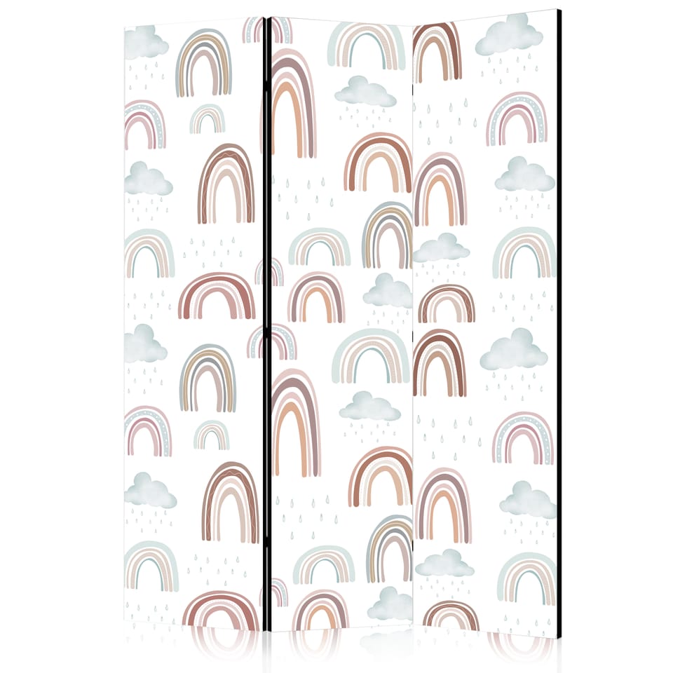 Parawan - Tęcze i chmury - Tęcze rozmaitych wielkości w stonowanej kolorystyce pośród deszczowych chmur w odcieniu blado-niebieskim rozmiar 135x172, wykończenie Akustyczny