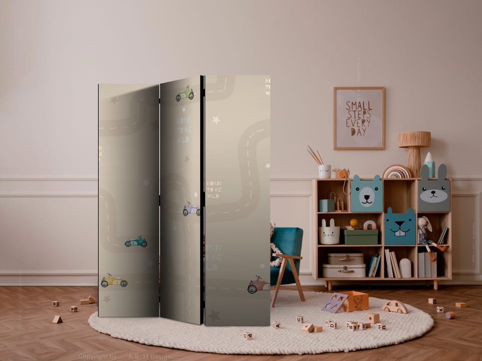 Parawan - Wyścig - kolorowe autka na drodze na beżowym tle w gwiazdki rozmiar 135x172, wykończenie Jednostronny
