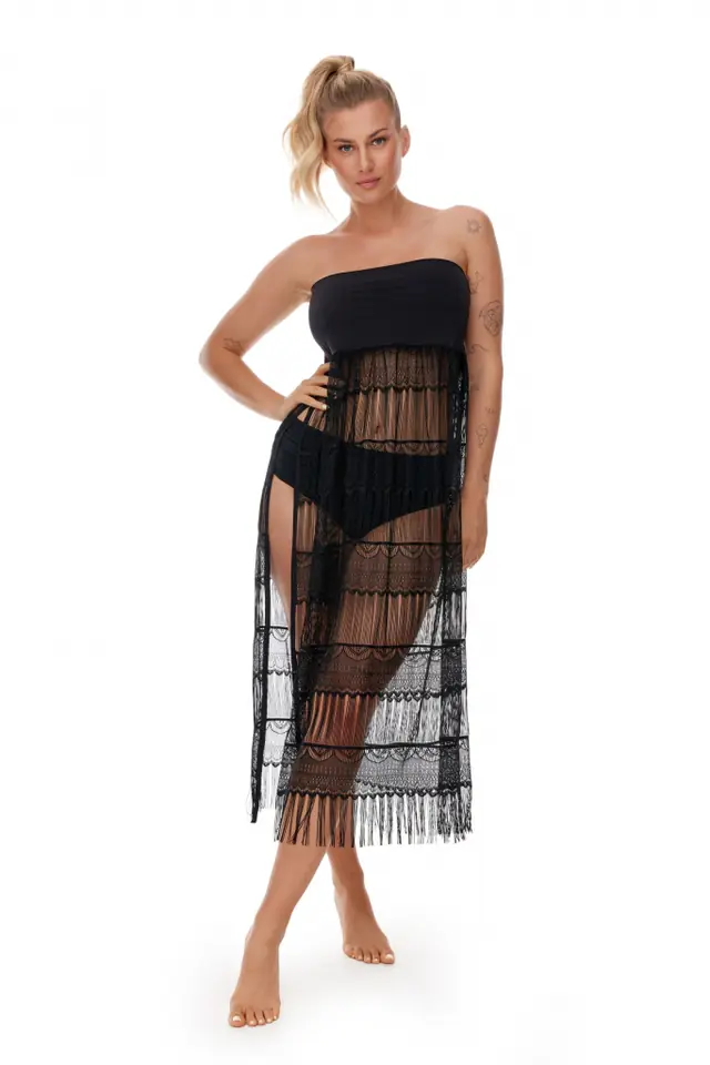 Czarne, plażowe pareo w formie tuniki w stylu Boho. Elastyczny top z dekoltem typu bandeau. Część spódnicowa wykonana z przezroczystej koronki z kokieteryjnym wycięciem oraz wykończona frędzlami. Może być noszone na dwa sposoby, w formie sukienki lub jako spódnica. Propozycja idealna zarówno na plażę oraz jako dodatek do letniej stylizacji. Skład surowcowy: 85% Poliamid, 15% Elastan