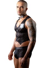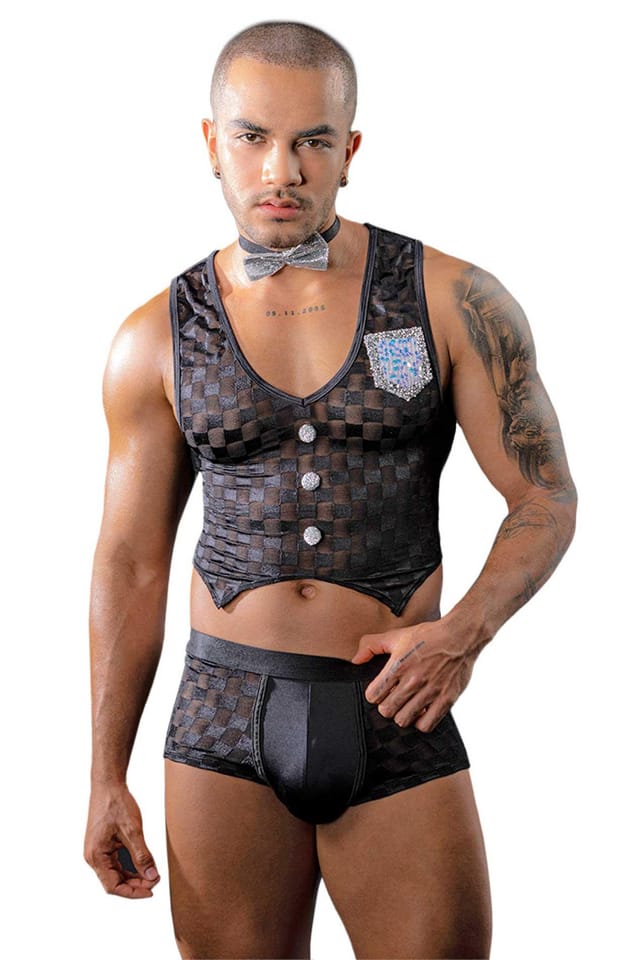 Seksowny strój kelnera Paris Hollywood dla mężczyznzabaw w odgrywanie ról i imprezowych wieczorówelegancję z wyraźną nutą prowokacji3 elementówKraciasta kamizelka w stylu barmanaDopasowane, półprzezroczyste bokserkimuszka z cekinamielastycznego i komfortowego materiałuUniwersalny rozmiar70–80 kgmęską bielizną oraz akcesoriami erotycznymiCechy produktu:Typ:Skład:Rozmiar:Zawartość:Kolor: