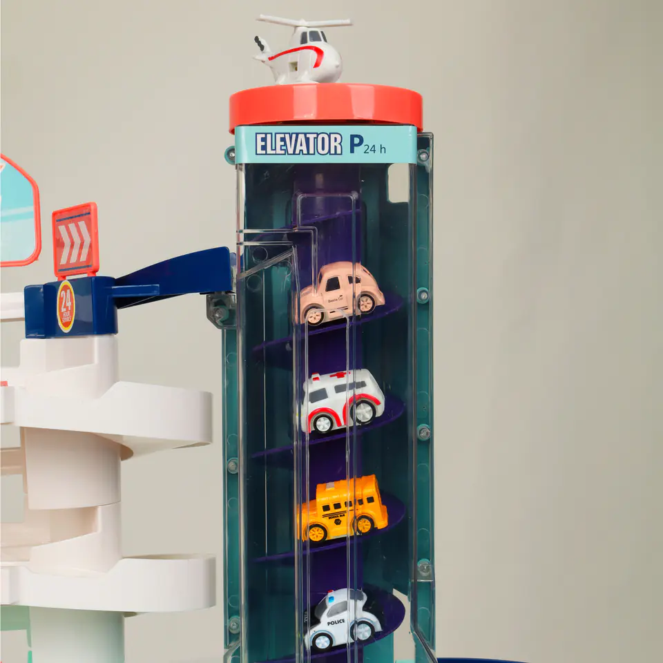 Winda może zabierać samochodziki automatycznie na samą górę parkingu. Po przełączeniu trybu na "Manual" winda będzie poruszała się zgodnie z obrotami lotniska helikoptera (wystarczy wprawić w ruch za pomocą jednego palca)