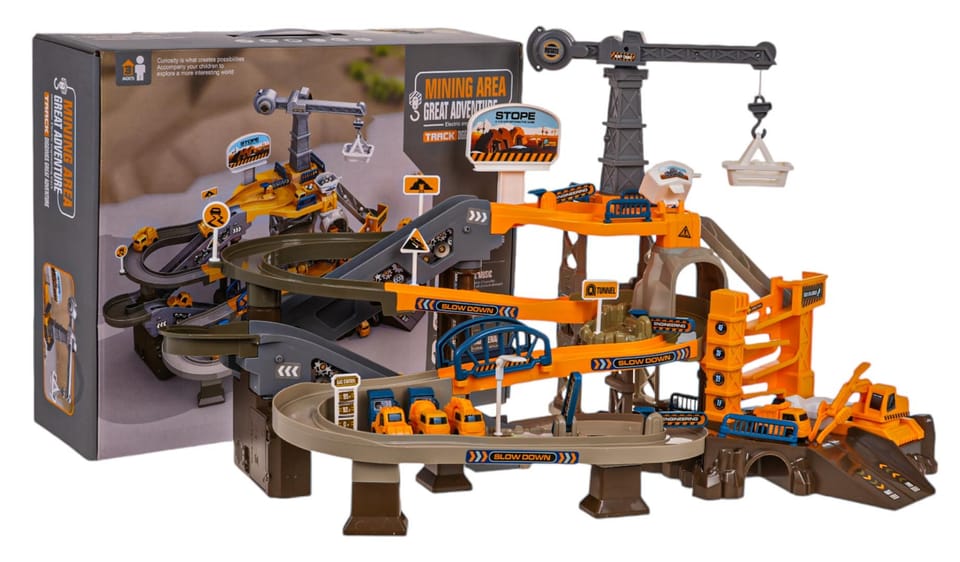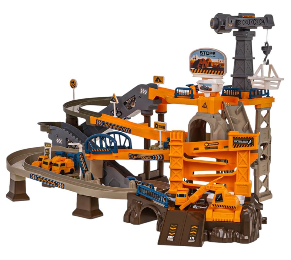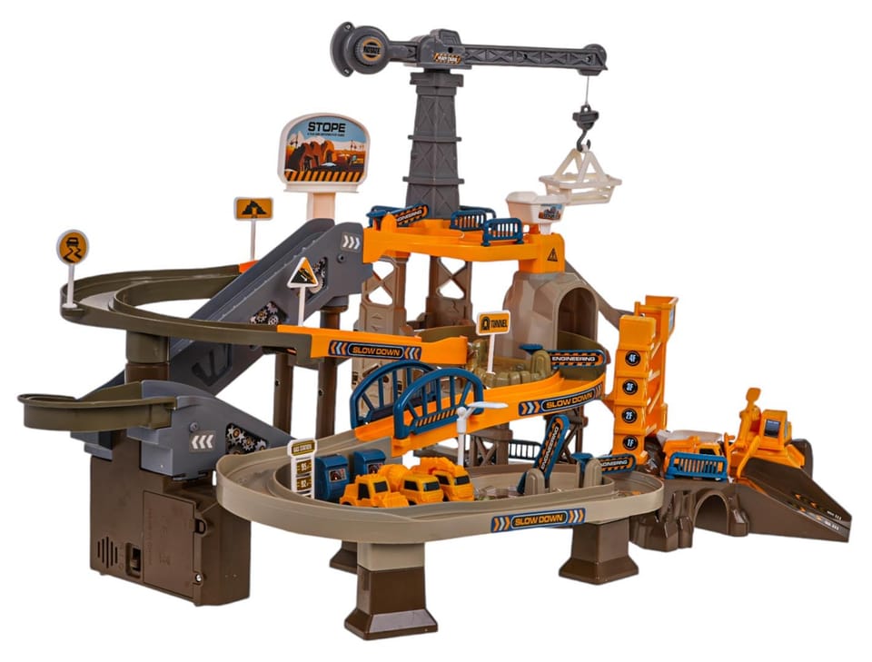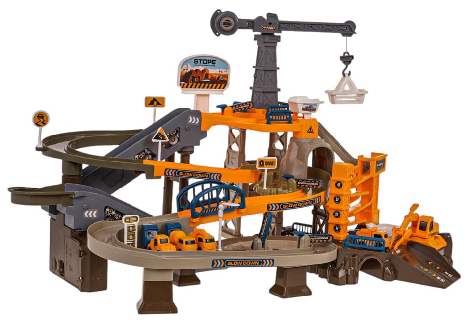 Zestaw parking, plac budowy z dźwigiem i autkami budowlanymi dla dzieci od 3-go roku życia. Wykonany został z najlepszej jakości plastiku w żywych kolorach. W tym zestawie znajdziemy wiele atrakcji taki jak garaż, parking, dźwig, stacja. Elektryczna taśma wyciąga pojazdy na tor do góry, a towarzyszą temu miłe dla ucha dźwięki. W tym zestawie mamy liczne zakręty, wjazdy, szlabany i tunele, nie sposób się nudzić. Jest też rynna na kamienie, która transportuje kamienie do specjalnego pojemnika. Kolejna maszyna umieszczona przy rynnie, przekłada kamienie do autek, by te zawiozły je na samą górę. Zestaw zasilany jest bateriami typu 3 x AA 1,5 V (brak w zestawie). Funkcje zestawu: - przeznaczony dla dzieci od 3-go roku życia, - wykonany z najlepszej jakości materiałów, - ruchomy dźwig: obrót ramienia dźwigu o 360 stopni, ruchomy hak góra i dół (manualnie), - 4 pojazdy budowlane w zestawie, - miłe dla ucha dźwięki, - elektryczna taśma wyciągająca pojazdy na tor do samej góry, - rynna do transportowania kamieni, - ruchoma maszyna do przenoszenia kamieni z pojemnika na samochody, - liczne zakręty, - dużo szlabanów do otwierania, - wiele możliwości zabawy.