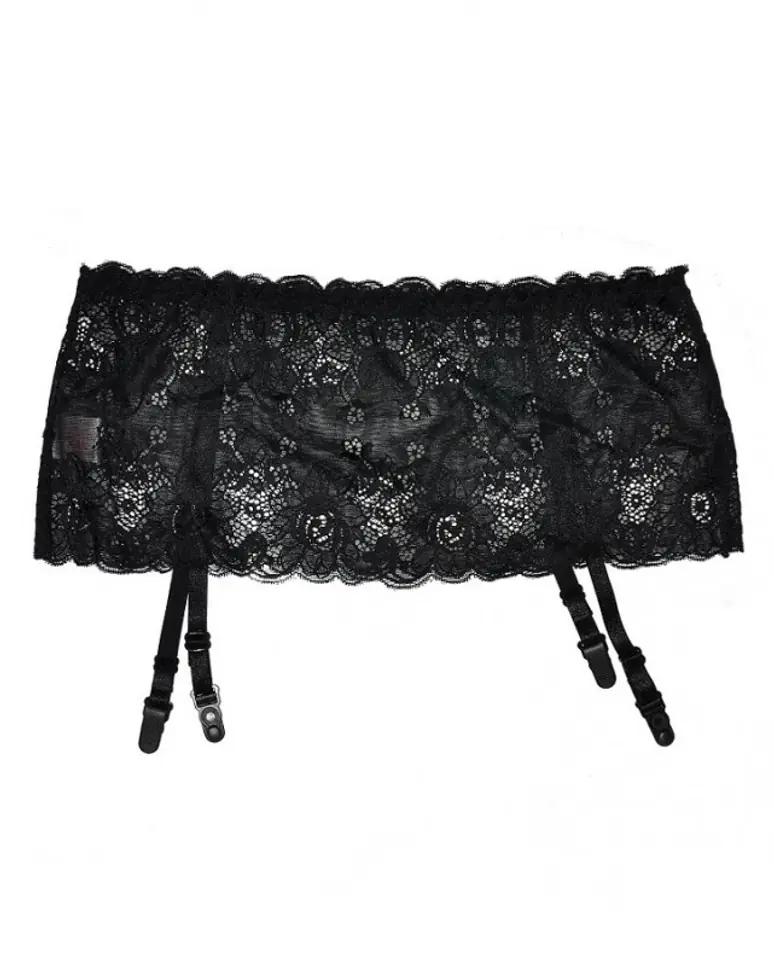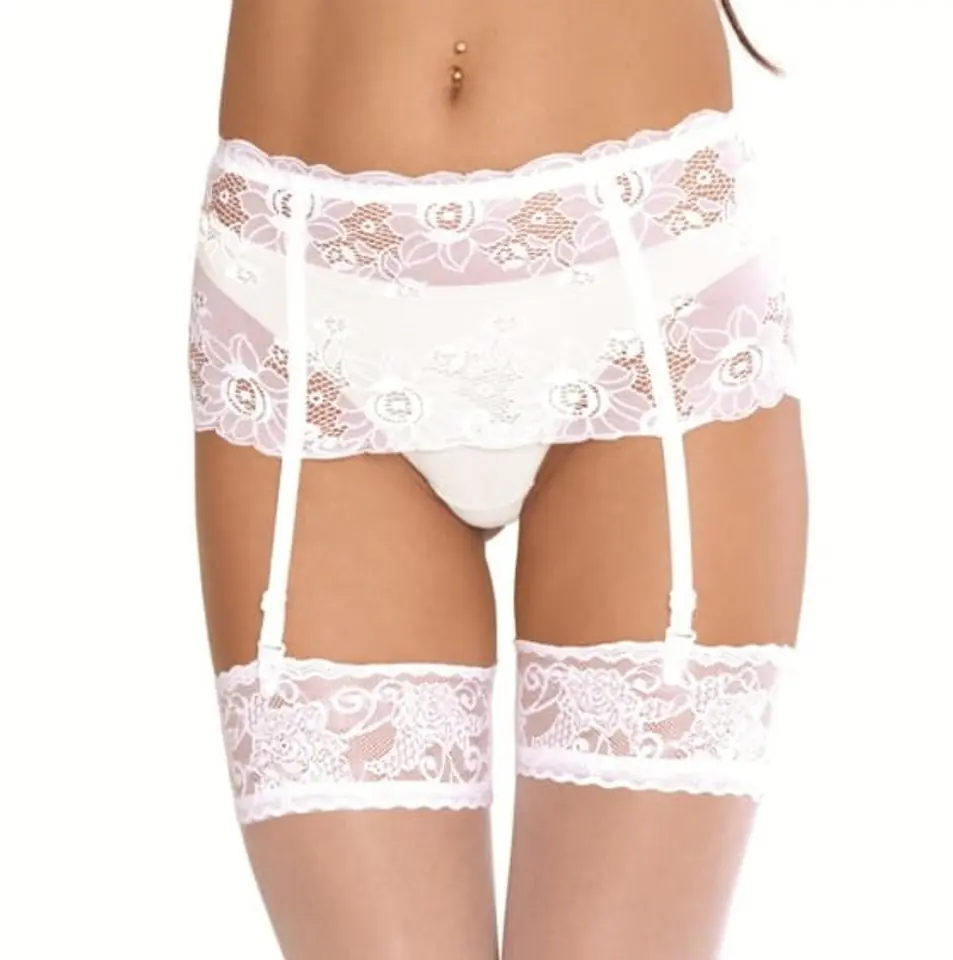 Efektowny pas do pończoch z szerokiej koronki, u dołu troczki z regulacją długości.