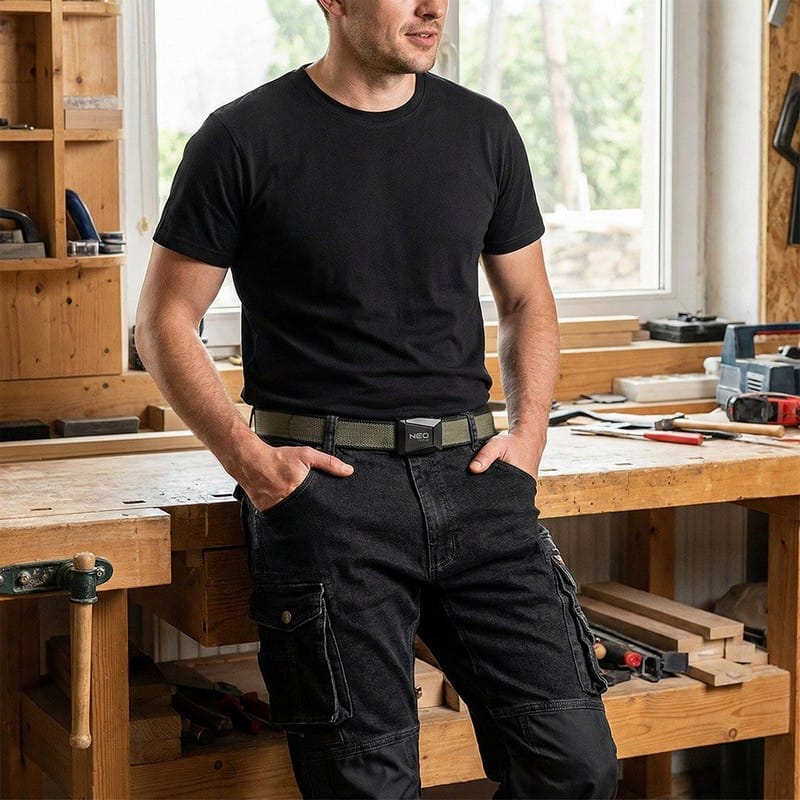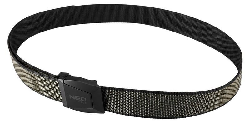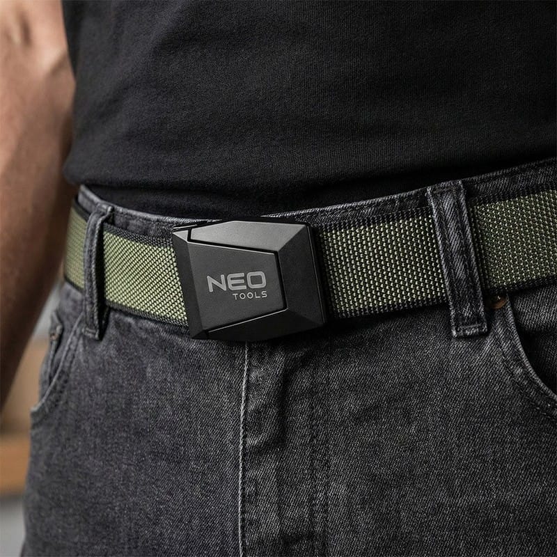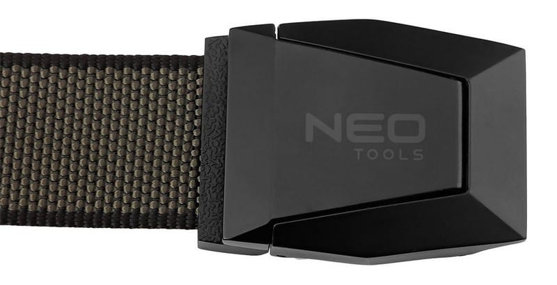 Wyposażony jest w klamrę wykonaną ze stopu cynku z logo NEO TOOLS, zapewniającą trwałość i stabilne zapięcie.